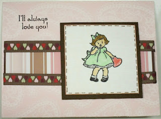 Yes, it is a pink card. I think I have plenty of Valentine's cards now. But, it is that time of year and there are so many cute things to stamp, cut, etc. When I was doing the black and white card a few nights ago in my hotel room, I also stamped and colored a few additional SU Greeting Card kids images. Nothing wrong with black and white, but it was screaming for color. I did two, one with a green dress and one with a blue dress. I was inspired to use the one with the green dress after hearing what the Wacky Wednesday Challenge is over at More Than Favors. The challenge is to use pink, green and brown on a project.